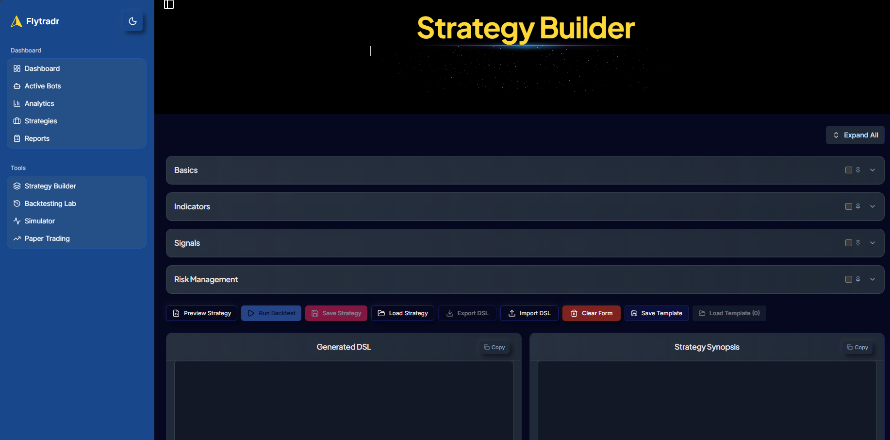 No-code is only useful if it remains precise. FlyTradr’s Strategy Builder lets you define entries, exits, indicators, filters, and risk rules visually—then compiles those rules into a validated JSON DSL. That means your strategy is portable and consistent across tools.